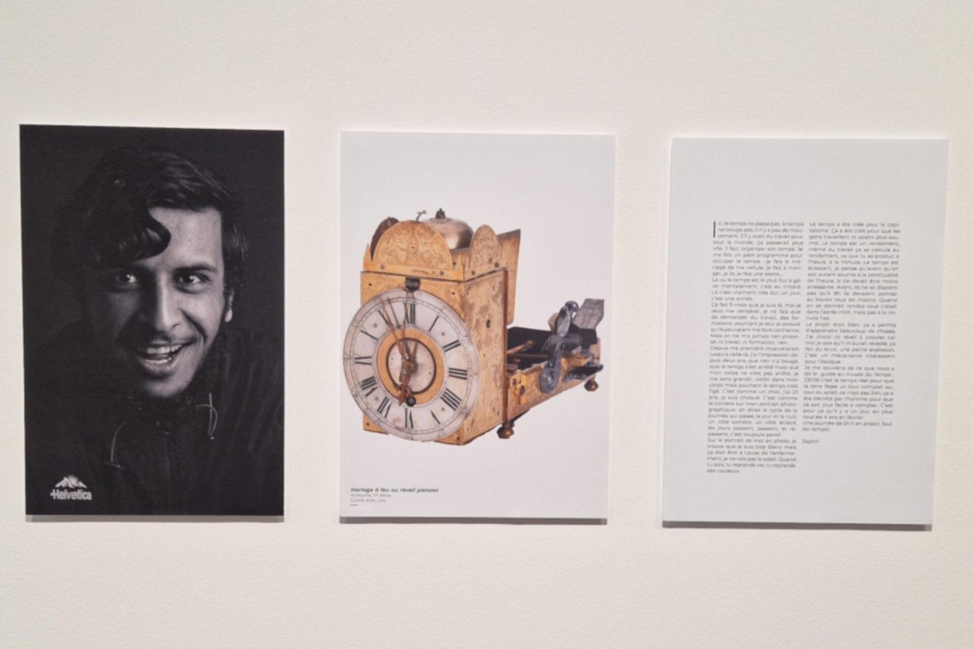 Nathan Muraz-Dulaurier : Le souhait de faire connaître cette action au grand public a émergé dès la conception du projet. Il s’agissait de présenter, à travers l’exposition, le portrait de ces hommes et de permettre de comprendre la manière dont le temps est vécu en détention. L’idée a été de valoriser sous forme de triptyques les photographies, les textes et les objets choisis par les personnes détenues. Chaque triptyque forme une œuvre à part entière, racontant une histoire unique et personnelle. Ils nous rappellent la complexité et la richesse de l’expérience humaine, même dans des circonstances difficiles. Un livret accompagne cette exposition. Il présente les portraits, textes et objets choisis par les personnes détenues. Ce livret est également enrichi par des photos prises lors de la visite du musée du Temps et de divers éditos rédigés par les différents partenaires.